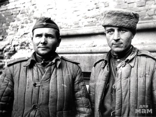 Перед штурмом Рейхстага. 150-я стрелковая дивизия. Командир 756-го полка п-к Ф.М. Зинченко (слева) и командир 674 полка к-н А.Д. Плеходанов. 28 или 29 апреля 1945, Берлин