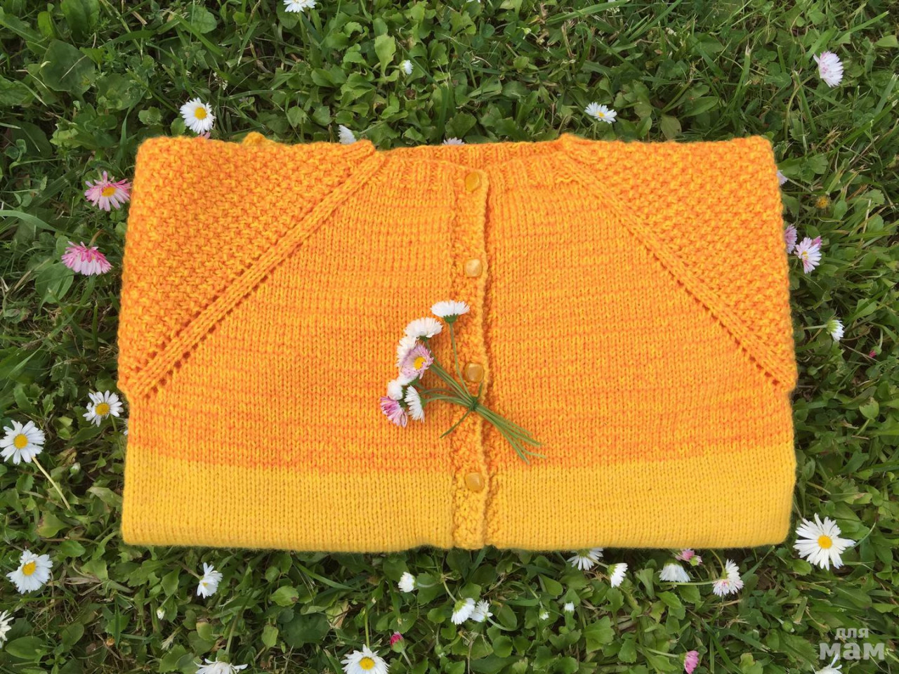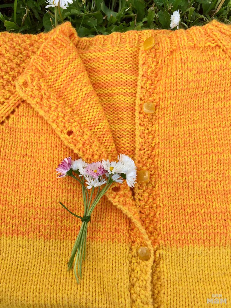 Кофта в две нити. Пряжа желтая и оранжевая: Пехорка «Детский каприз», 50% мериносовая шерсть/ 50% фибра. Ещё одна желтая пряжа: Троицкая «Москвичка», 50% шерсть / 50% полиамид