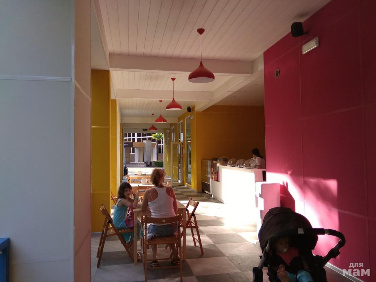 Тут же находится детское кафе «Карамелька» в котором можно полакомиться (БЕСПЛАТНО!!!) мороженым, молочным коктейлем, сахарной ватой, попкорном, фруктами, печеньками, чаем (наверно и кофе есть, не помню), вода, соки, молоко и йогурты Фруто-няня. Есть столики, можно посидеть, пока детки Ваши бегают на площадке.