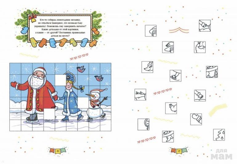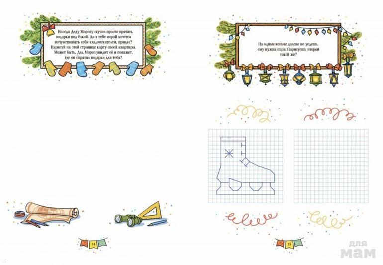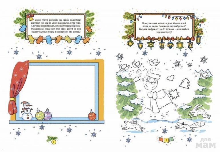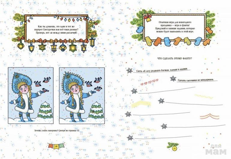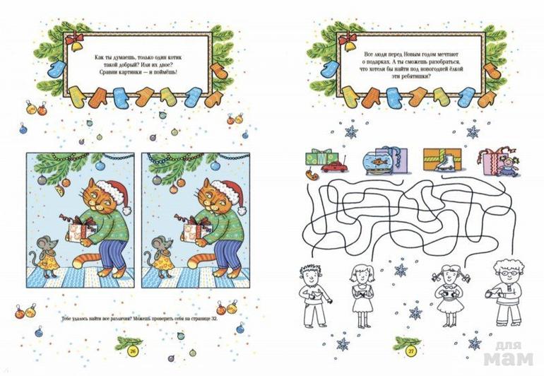 А чтобы для вас, дорогие дети и уважаемые родители, предновогоднее время пролетело ещё быстрее, мы сделали эту волшебную книгу. И наполнили её самыми разными увлекательными заданиями: рисуйте и раскрашивайте, ищите отличия и проходите лабиринты, разгадывайте новогодний кроссворд и мастерите праздничные открытки.