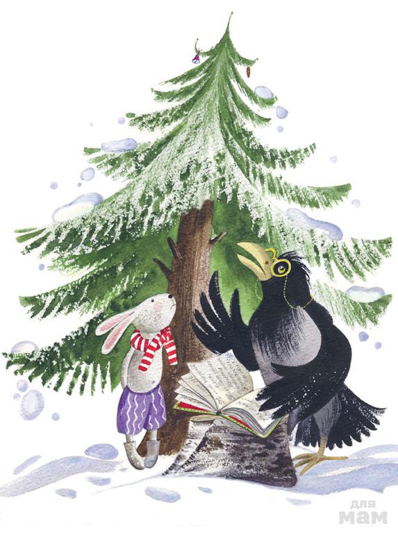 "Смотри не заблудись!" - говорит ворона в красном с белым помпоном колпачке голодной лисице, пробирающейся по узенькой тропке. И роняет сыр, естественно.
