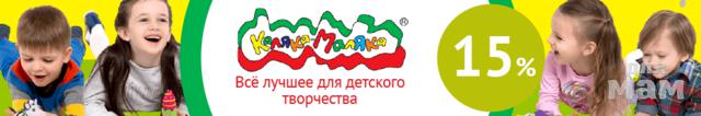 скидка 15% на карандаши и фломастеры, краски и кисточки, ножницы и клей, цветную бумагу и альбомы, пластилин и тесто, а также творческие наборы от «Каляки-Маляки».
