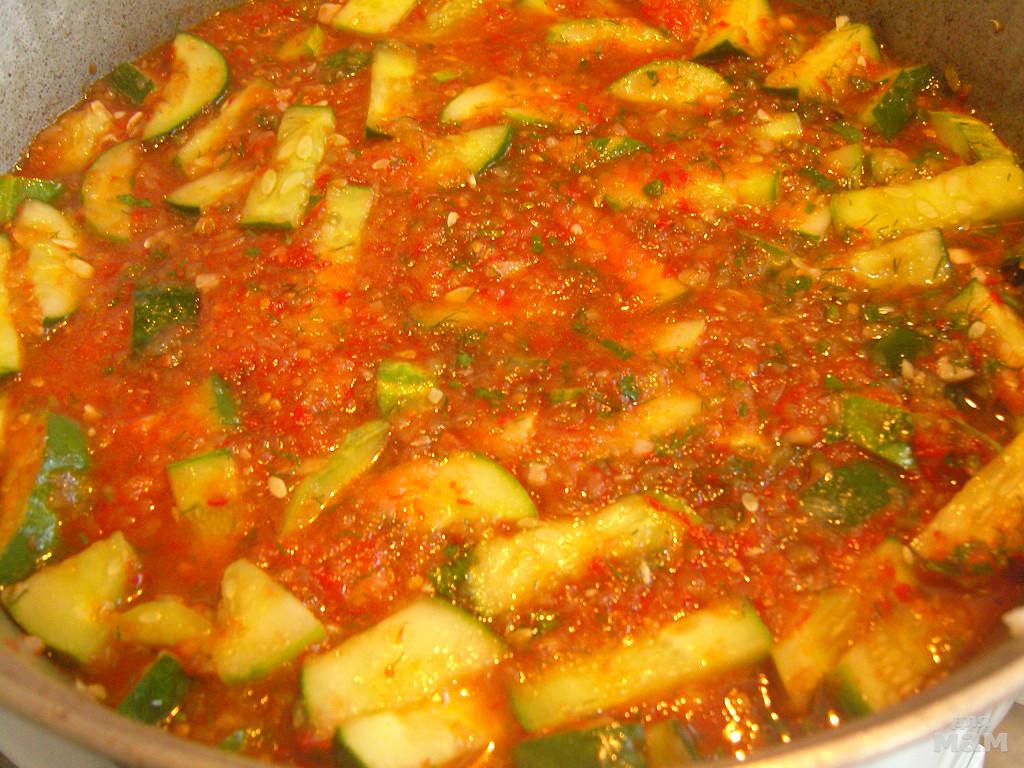 Хорошо перемешать , дать закипеть,варить на медленном огне 10 мин не больше ,иначе огурцы будут мягкие.