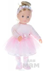 Кукла Dimian "Molly Ballerina" - это превосходный подарок для любой девочки. Кукла с длинными белокурыми волосами одета в розовую балетную пачку, нежно-розовые колготки и мягкие текстильные пуанты. Волосы красавицы собраны в классический балетный пучок. Голову украшает повязка с атласными розами. Голова, ручки и ножки куклы выполнены из пластика, а тело - мягконабивное. Куколка закрывает глаза, если уложить ее на спину. При нажатии на правую ручку куклы заиграет одна из восьми классических мелодий знаменитых композиторов.