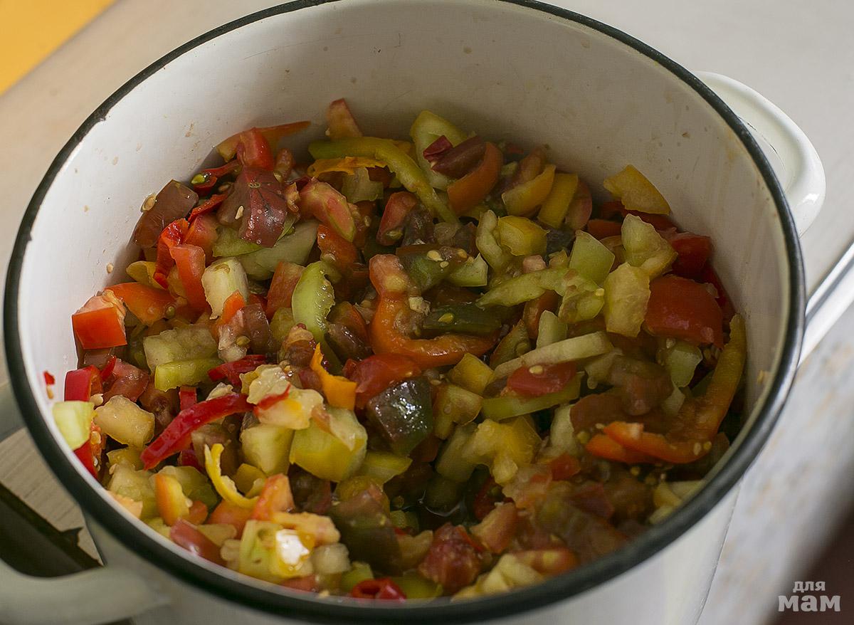 Помидоры порезать кубиками, перцы сладкие и острые кольцами.
