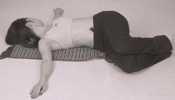 Ляг на спину и постарайся максимально расслабиться. Дыши ровно и глубоко, представь себя в тихом и красивом месте. Раскинь руки в стороны. Соедини ноги вместе и согни в коленях. Колени подтяни к грYди. Сделай глубокий вдох и поверни колени вправо, стараясь уложить их на пол. Голову поверни влево и медленно выдыхай.