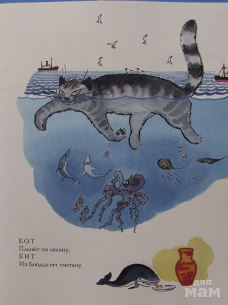 Это история в стихах о том, что стоит поменять всего одну букву в слове: и КИТ начинает преспокойно лазить по деревьям и есть из блюдца сметану, а КОТ распугивает в морях китобоев. При первом прочтении книги сына, конечно впечатлило превращение КИТА в КОТА.