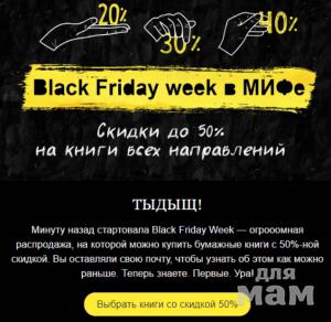 Black Friday week 2018С 15 по 25 ноября на сайте МИФа самая большая распродажа года.Книги на сайте стоят дешевле на 15%, 30% и 50%.