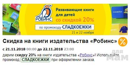 Скидка на книги издательства «Робинс»до 22.11.2018 23:00дарим скидку 20% на книги издательства «Робинс»! Используйте промокод СЛАДКОЕЖКИ при оформлении заказа.