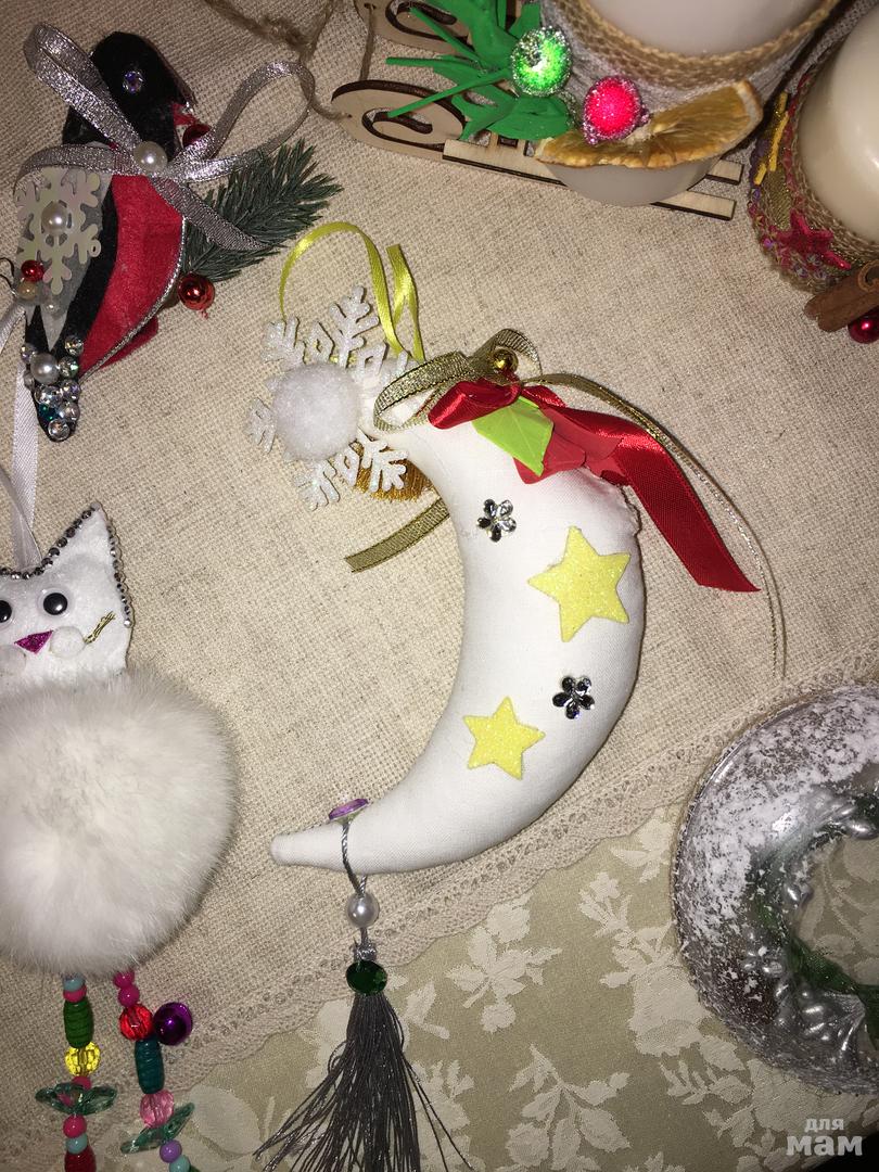 Полумесяц, набивали холлофайбером, доченька делала листики и звездочки из фоамирана Украсили ленточками ,снежинкой и белым помпончиком.