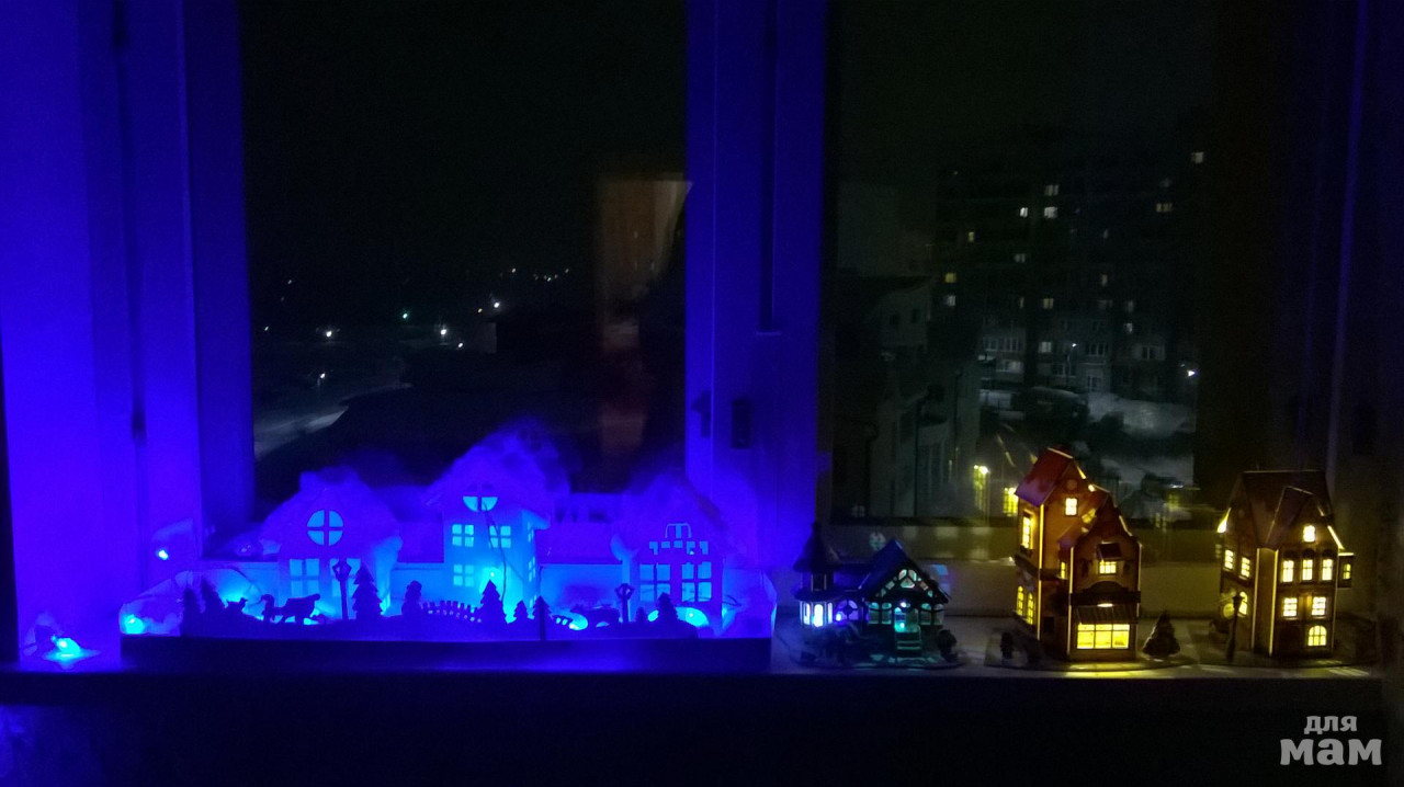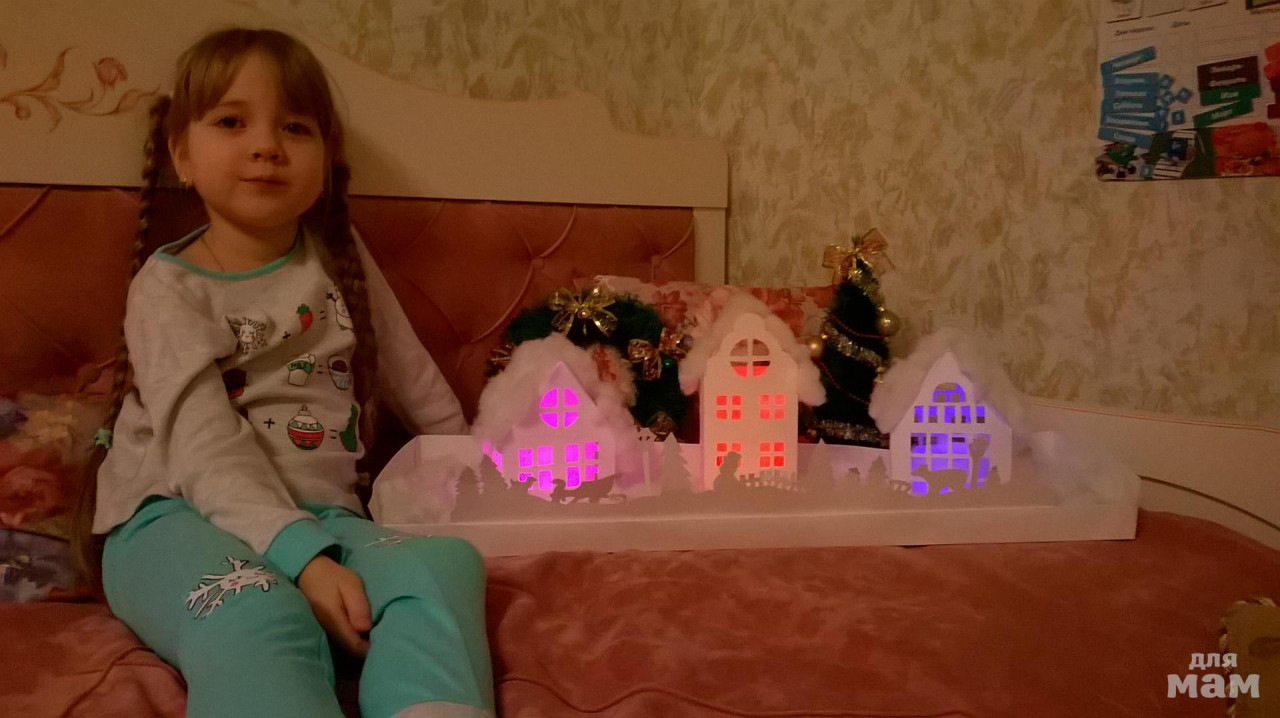 А со старшей дочкой мы приготовили сюрприз для младших.Идея не новая,но по-моему гениальная)Этот сюрприз заменил нам елку.про нее просто забыли,она скромно стоит скучает.А вся семья собирается по вечерам и глаз не может оторвать от светящихся домиков.