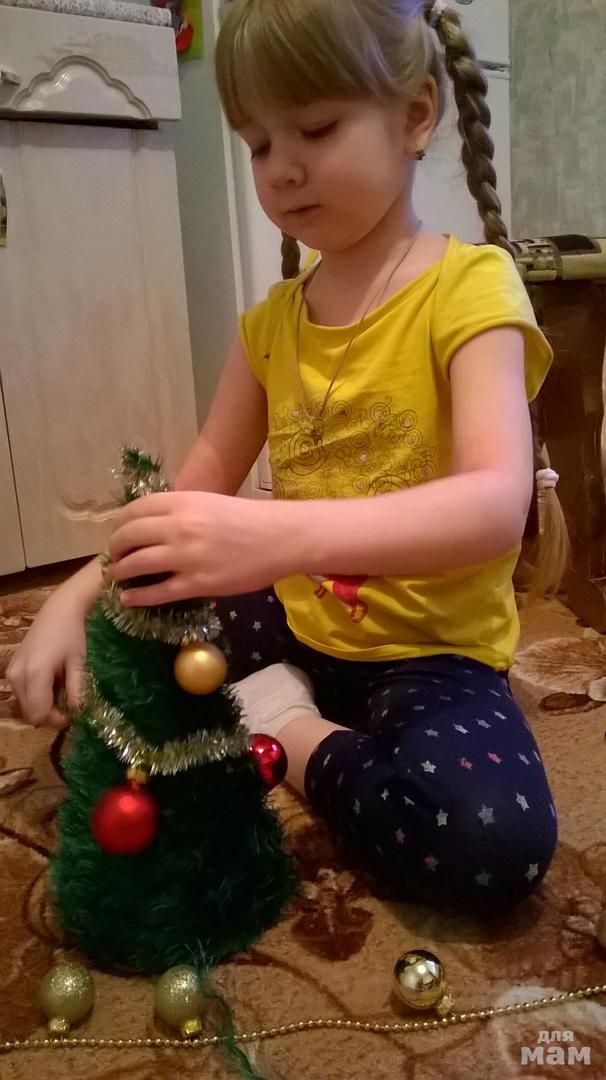 Потом придумывала чем украсить.выбор вариантов украшений у нас был небольшой.дочка аллергик поэтому решили обойтись без клея.Мишуру и бусы я аккуратно сверху закрепила проволочкой,Настюша нанизала шарики,обмотала елочку.а снизу я закрепила скотчем.