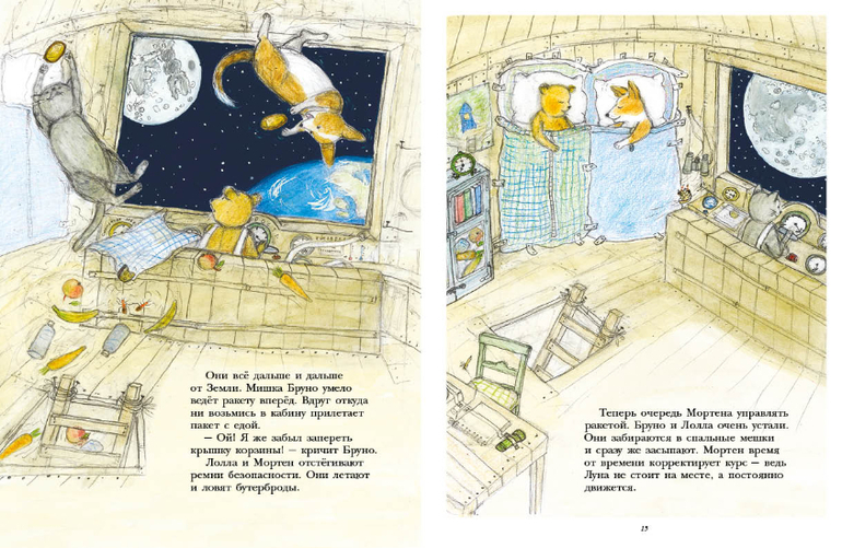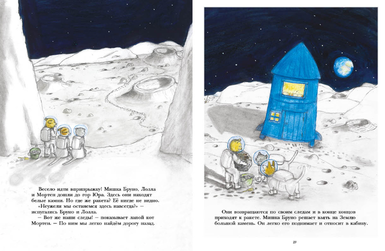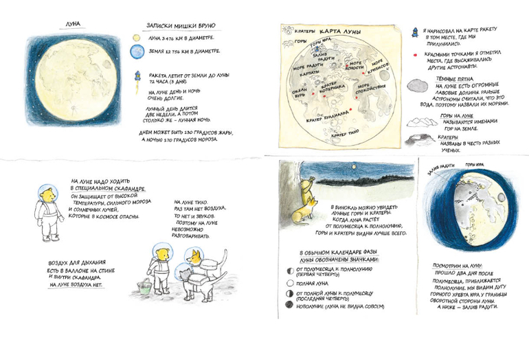В конце книги читателя ждет особая познавательная часть - "Записки мишки Бруно". Там есть карта Луны, сведения о ее размерах и географии, а также доступное объяснение того, что такое сила земного притяжения и почему Луна видна нам то целиком, то лишь наполовину, а то и вовсе не видна.