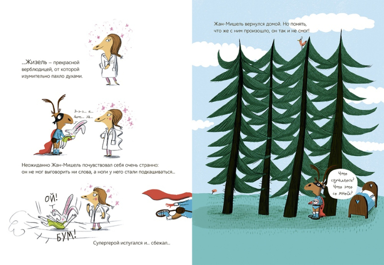 Супергерой Жан-Мишель влюбился в прекрасную верблюдицу Жизель с первого взгляда. Отважный северный олень готов рассказать ей о своих чувствах, но признание в любви - сложная задача даже для супергероя. Каждый раз при виде Жизель с Жан-Мишелем происходит что-то странное: путаются буквы, забываются слова, подкашиваются ноги, ему хочется убежать и спрятаться.