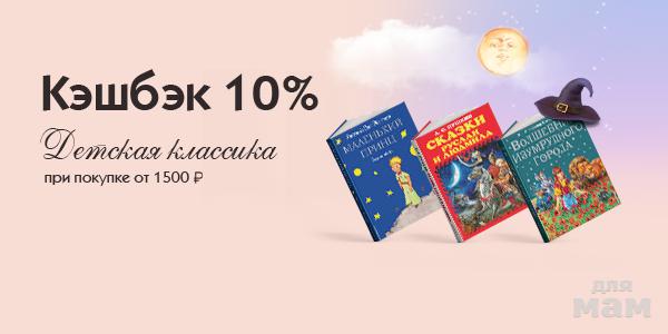 Книги для детей с кэшбэком 10%Условия участия:Добавьте в корзину книги из раздела на сумму от 1500 рублейВыберите оплату онлайн и оформите заказПолучите кэшбэк баллами в размере 10% от покупки