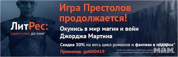 по 25 апреля на сайте ЛитРес действует акцияк премьере последнего сезона "Игры Престолов":книга жанра «фэнтези» в подарок и 30% скидка на все произведения писателя.Для участия необходимо перейти на страницу и активировать промокод gotlit0419 .