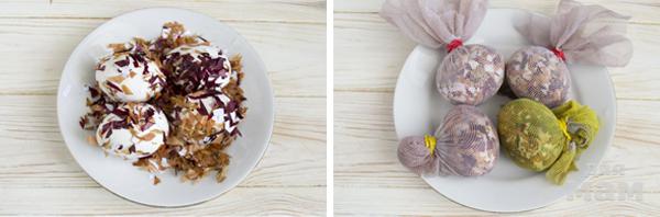 1.Разомните на мелкие кусочки шелуху. Промытые яйца, пока они еще мокрые, обваляйте в шелухе так, чтобы ее кусочки прилепились к ним.