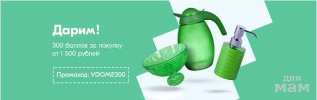 VDOME300 - 300 баллов на счетАктивируйте промокод Оформите заказ на сумму от 1500 рублей из раздела Все для дома и дачиПосле получения заказа вам будет начислено 300 баллов на счет.