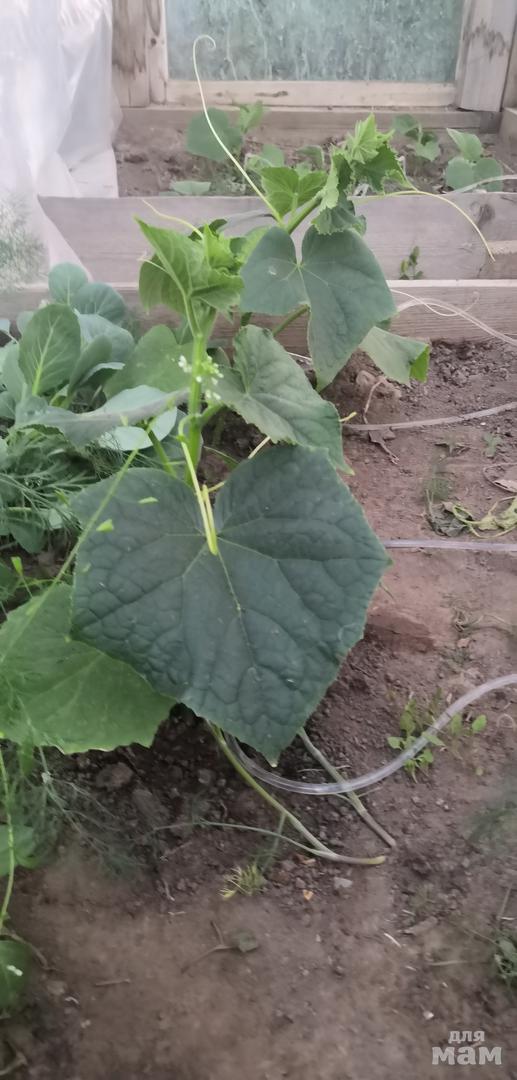 Примерно вот так сейчас выглядят мои огурчики в теплице. Их я проращивала скруткой, в середине апреля. И сажала в стаканчики. Потом 3.05 посадила сюда, на пробу 3 штучки. Вообще у меня огурцы в теплице не идут. В этом году эксперимент. Огородила часть теплицы плёнкой, от помидор. Проветриваю редко. Помидоры наоборот