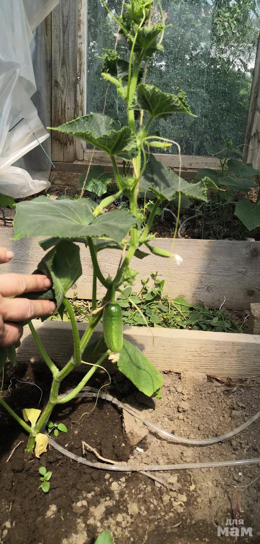 Ну и первые огурчики. Эти в теплице. Такого же возраста в бочке, там уже один огурчик сорвали, малюсенький. Но там я не ослепляла. У меня в теплице капельный полив, автоматический, для огурцов. В эти вых приехала, там батарейка села. Листики завядшие стоят. Но слава богу оклемались, надеюсь в вых порадуют. Если детки не съедят все до меня🤗.