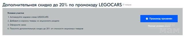 Активируйте промокод LEGOCARS на странице Акции , и к скидке из распродажи прибавится скидка до 20% по промокоду! В итоге некоторые получаются со скидкой 50%! Суммарная скидка сразу видна в каталоге, товары отмечены меткой "Доп.скидка":