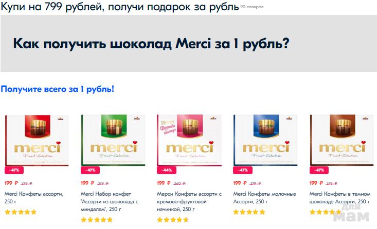Для того чтобы получить Merci за 1 рубль необходимо: добавить в корзину товары, размещенные на странице на сумму от 799 рублей http://bit.ly/2L9z9RZ