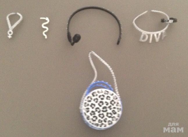 Аксы: Подвеска на шею, сережки (нам к сожалению не повезло и в ком-те была всего одна сережка, псмотрела обзору кукол в интернете у всех по две), наушники с микрофоном, пояс и сумочка.