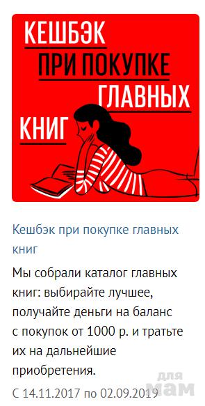 Сегодня завершается акция Кешбэк при покупке главных книгпо 02.09.2019Кешбэк рассчитывается так:заказ от 1000 р. до 1 999 р. — вознаграждение 3%;заказ от 2 000 р. до 14 999 р. — вознаграждение 5%;заказ от 15 000 р. — вознаграждение 10%.