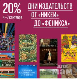 Дни издательств.С 4 по 7 сентября — скидка 20% на более чем 25 000 книг на выбор. От «Никеи» до «Феникса»