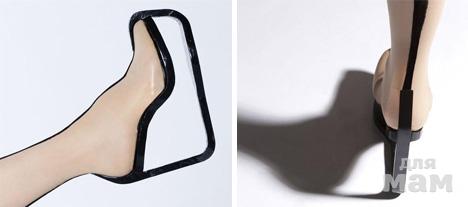Спросите любую женщину, какая самая важная часть обуви, и она непременно ответит что шпилька. Дизайнеры не стали долго раздумывать и развили идею обуви с полностью открытым носом. Но развили слишком далеко. Проще говоря, привязали шпильки к пяткам обладательницы сего шедевра.