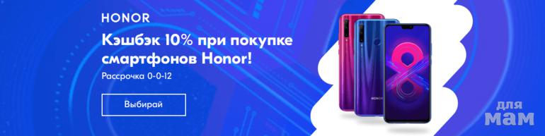Кэшбэк 10% при покупке смартфонов Honor