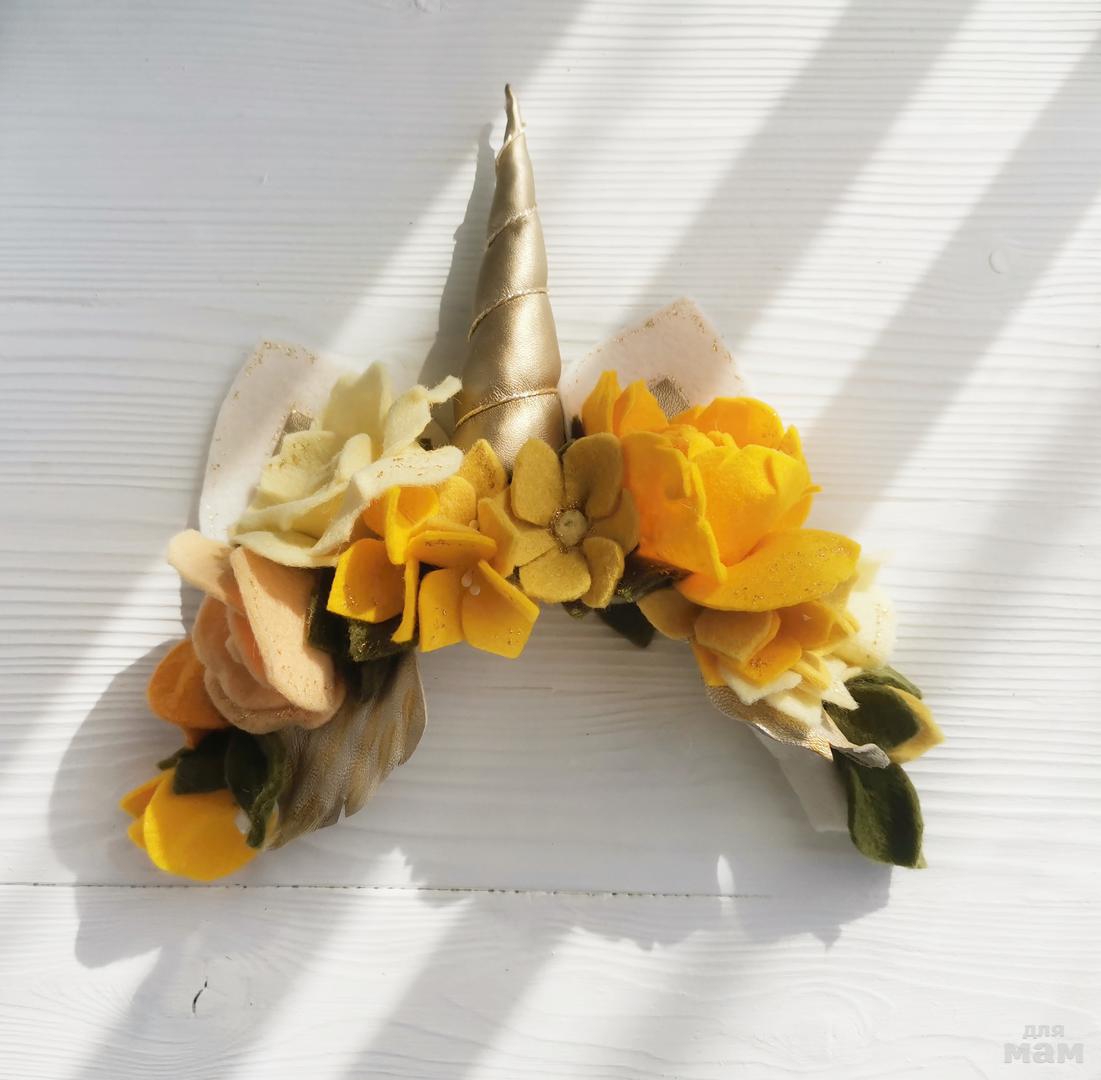 Солнечный единорог с цветами из фетра и листочками из натуральной кожи. Крепление на выбор - ободок или повязка. Цена 1000р