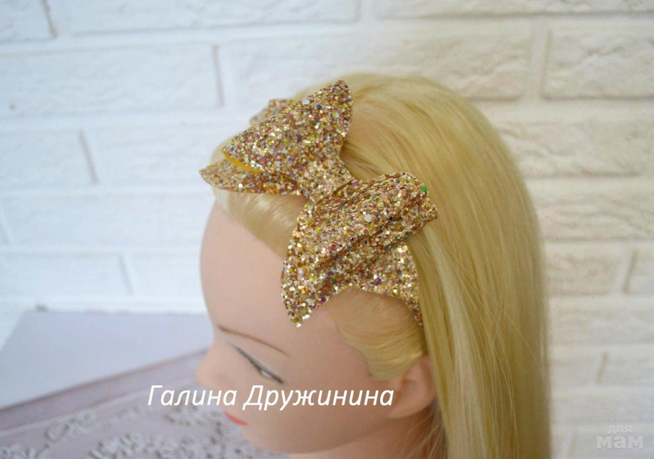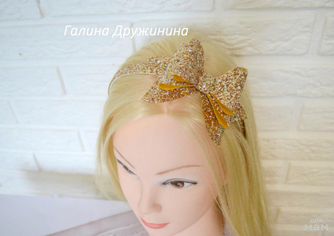 4) Ободок с шикарным бантиком. Материал экокожа золото с цветным вкраплениями. На солнышке сверкает всеми цветами радуги. Постаралась заснять на разных фонах, чтобы передать все красоту ободка. Экокожа и на ободке в тон.