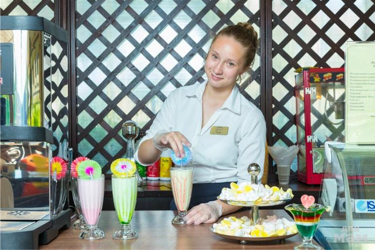 Меню кафе «Карамель» включает в себя легкий попкорн (традиционный соленый или карамельный), до десяти наименований десертов, тортов, сладких блюд, а также напитки из бара - чай, кофе, какао для детей. Изюминка кафе - молочные коктейли, которые создаются на основе молока высшего качества и свежих фруктовых соков. Фрукты и фруктовые салаты, клубничное, шоколадное мороженое, помадки и сиропы к нему - в кафе «Карамель» невозможно не зайти хотя бы раз в день! Входит в систему все включено!