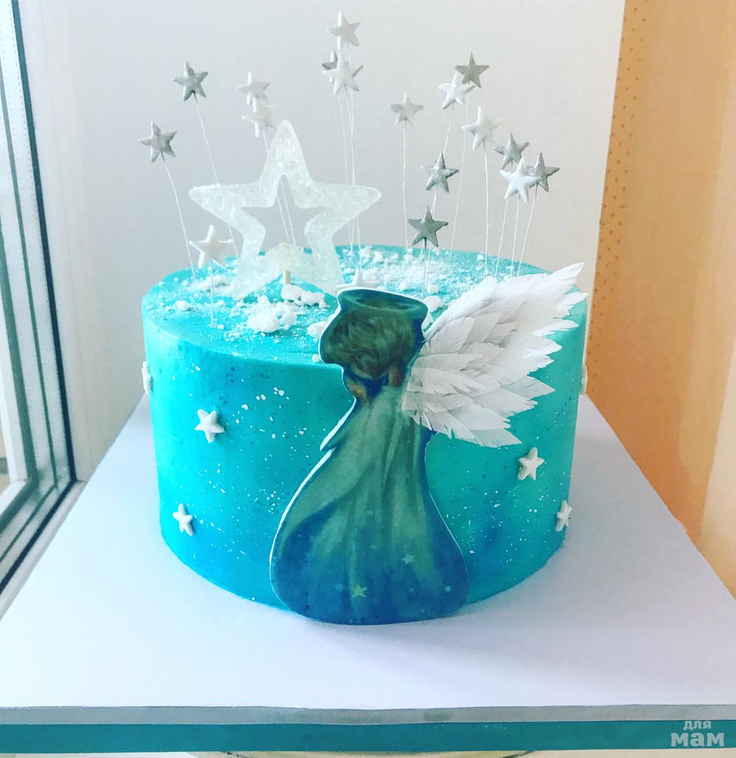 Внутри шоколадно-вишневый. Декор-сахарная картинка, звезда из карамели, крылья ангела-вафельная бумага.