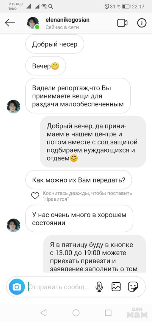 Сейчас мы сотрудничаем с Соц.защитой города и помогаем не только вещами, но и информационно для сбора средств погорельцам, приглашаем детишек из малообеспеченных семей к нам в гости, дарим им подарки, совместно с другими организациями города. Даже московский фонд "Многомама" подключился к нашей деятельности!!!