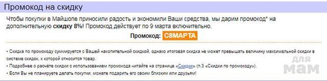 Промокод суммируется с накопительной скидкой, но в Майшоп товары делятся на определённые категории, и не всегда промокод/сертификат может дать желанный итоговый размер скидки. Есть ограничения и исключения: