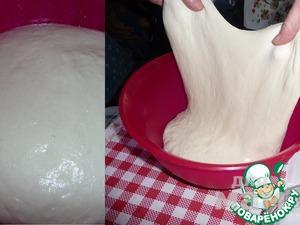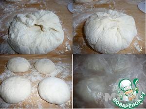 Двухэтапный процесс выброжения теста закончен. Тесто не расплывается, к рукам практически не липнет. Тесто выложить на хорошо припыленную мукой доску, присыпать весы мукой, взвесить и разделить на 4 равные части.