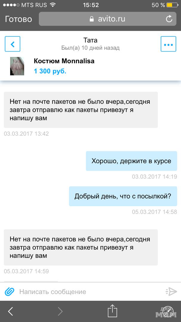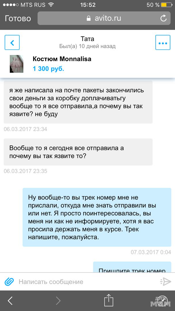 Как видете ни трек мне не прислала ни костюм. Вчера я позвонила поднял трубку типа муж, сказал что вечером дома будет, на просьбу дать номер Татьяныон сказал " у неё телефон не работает" позвонила вечером трубку никто не взял, сегодня тоже не берет. отправляла смс на него я тоже не получила ответ. Остерегайтесь не порядочных людей. Вот ещё Ее объявления на авито