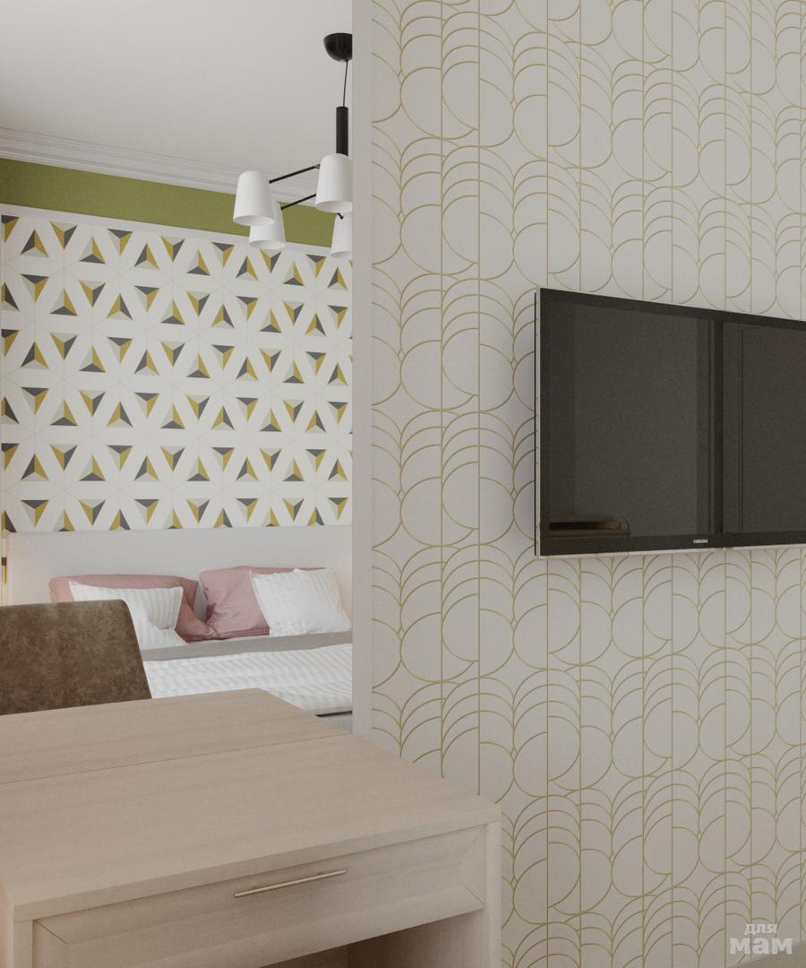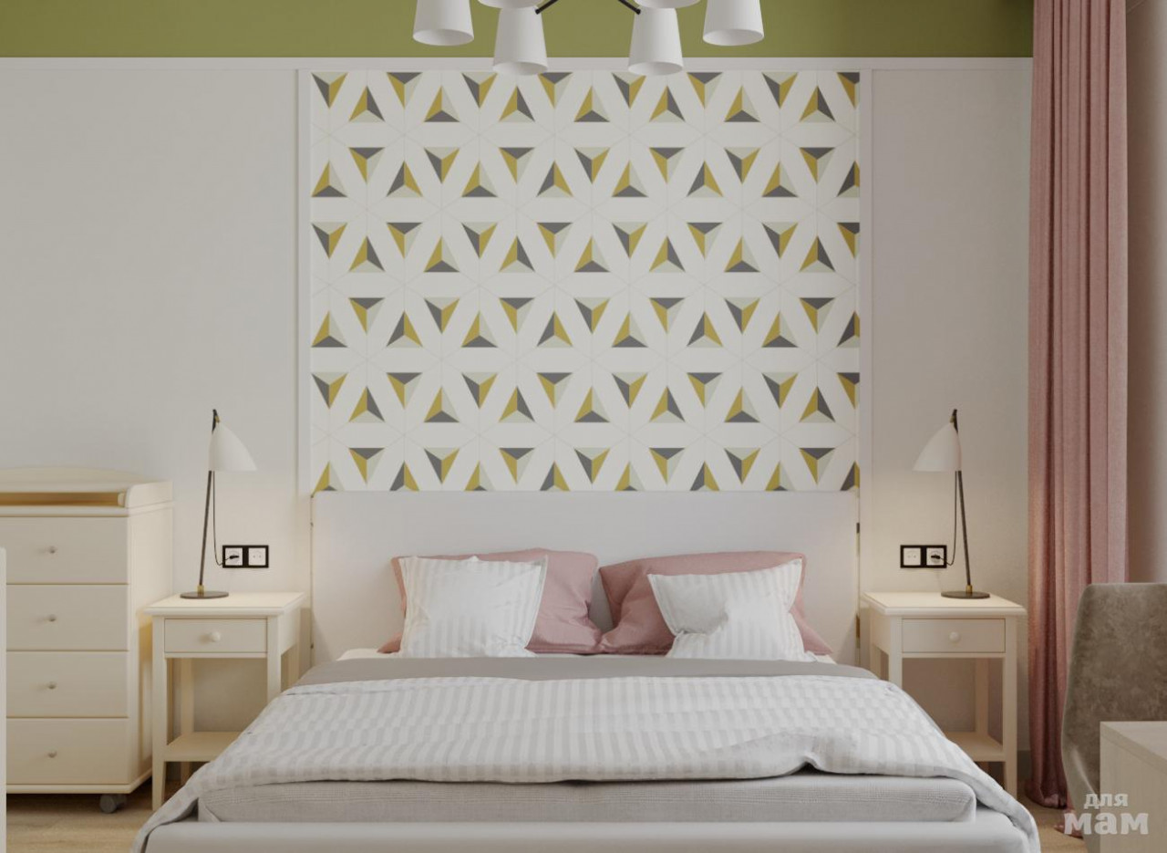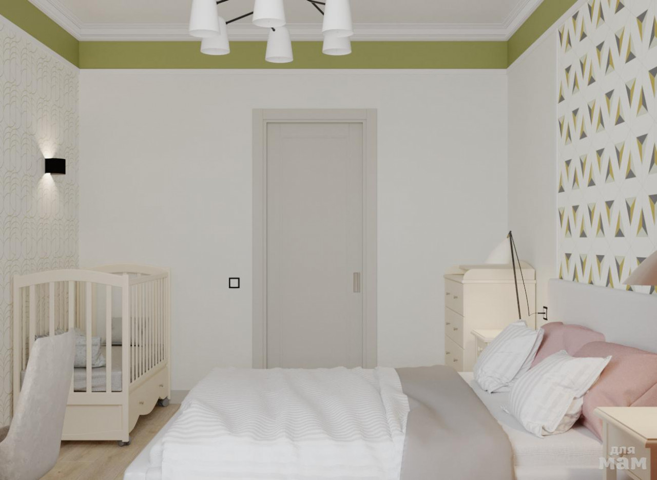 У заказчиков недавно родился малыш. Необходимо было разместить кроватку и пеленальный комод. Столик туалетный и стул уже имеются. В дальнейшем на месте комода можно будет разместить еще шкаф. Сейчас есть отдельный гардероб.