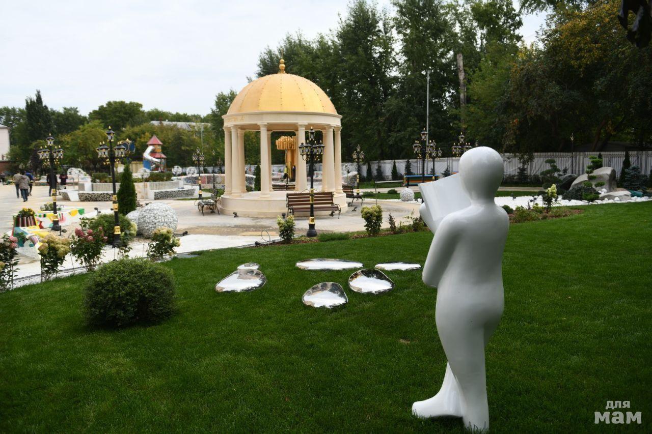 В учебном заведении появились новые литые ворота, беседка, различные скамейки, фонари, скульптуры, газоны и клумбы. Многие объекты выполнены в золотых тонах.