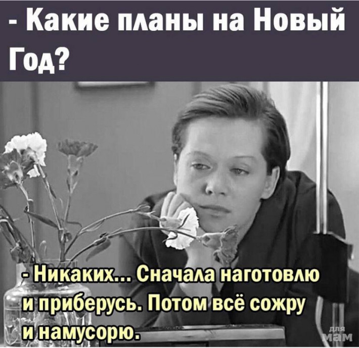 Наготовлю, приберусь, сожру, намусорю))) классный план на Новый год. Может так и надо?