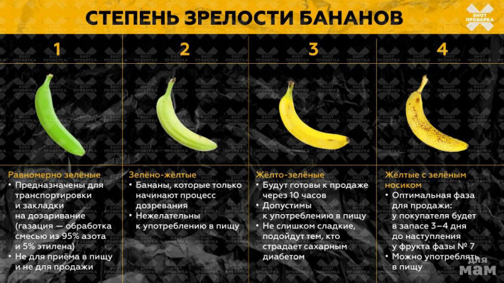 Остальные стадии лучше не трогать — такие бананы могут содержать вредные химические вещества или скрытую плесень.