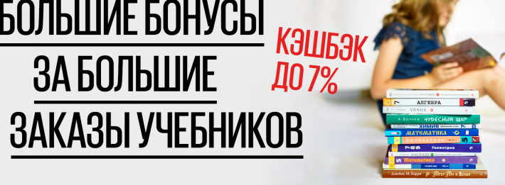 Организуя заказы учебников и книг для школы, вы получаете бонусы на баланс. Для участия достаточно положить книги из раздела «Школа» на 5000 р. в корзину и активировать промокод CASHBACK.