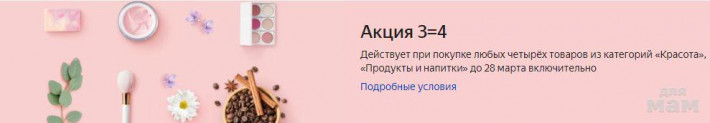 Действует при покупке любых четырёх товаров из категорий «Красота», «Продукты и напитки»