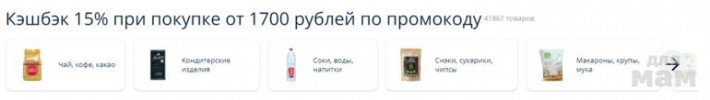 Кэшбэк 15% по промокоду при покупке продуктов питания на сумму от 1700 рублей