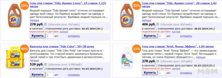 Скидки до 36% на средства для стирки Tide, Ariel, «Миф» и Lenor