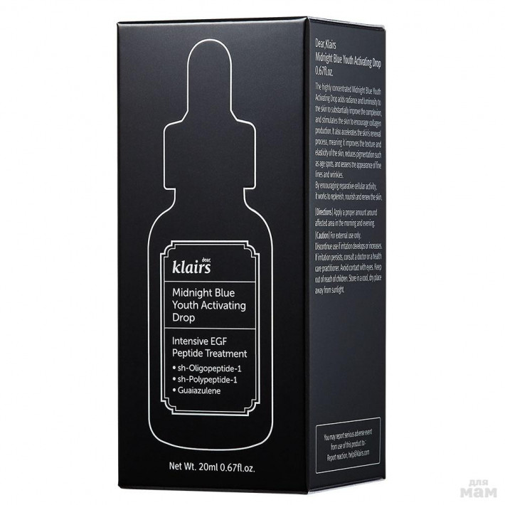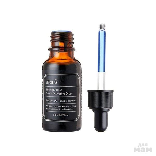 Антивозрастная сыворотка Dear, Klairs Midnight Blue Youth Activating Drop содержит экстракт черники, аденозин, гвайазулен, EGF, bFGF. Работает как с уже имеющимися морщинками так и предотвращает появление новых, продлевая молодость кожи.