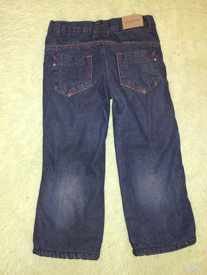 Джинсы фирмы Play today,на рост 104.Подходят на пухленьких деток,мы носили с ремнем.Сезон до холодной осени или холодной весны,плотный джинс и плотный флис.