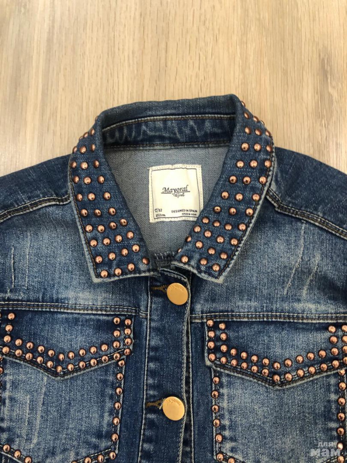 Джинсовая куртка Майораль, классная, вся в заклепках, носили очень мало, в отличном состоянии, р. 12 (152), маломерит. Рукав 53, длина 47, под мышками 42, 2000 р. всего.